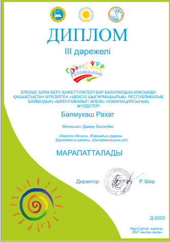 3-орын Балмукаш Рахат «Қиял-ғажайып әлемі» отбасым туралы әңгіме. Жетекшісі Дамер Б.